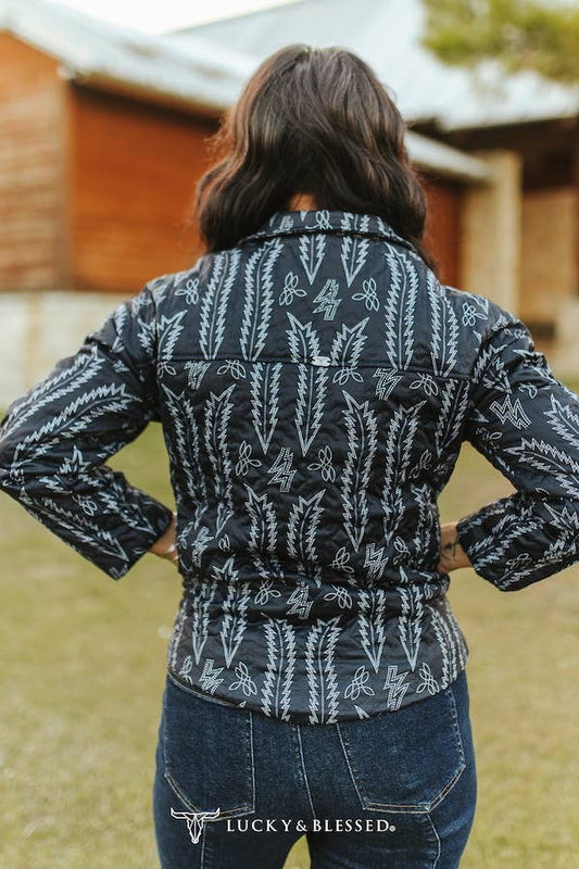 Black Bootstitch Printed Quilted Jacket W Front Pockets