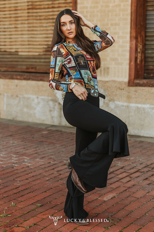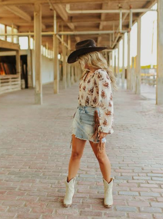 Cream Horse Printed Puff Sleeve Mesh V Neck Long Sleeve Blouse