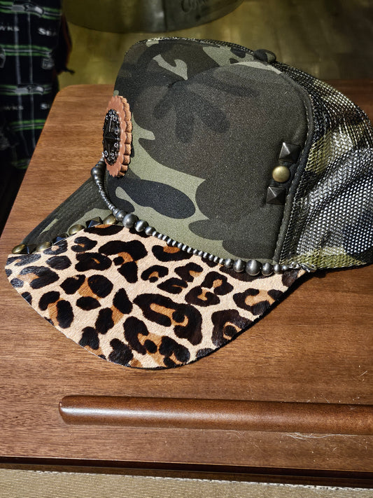 Western trucker hat with cowhide and conchos