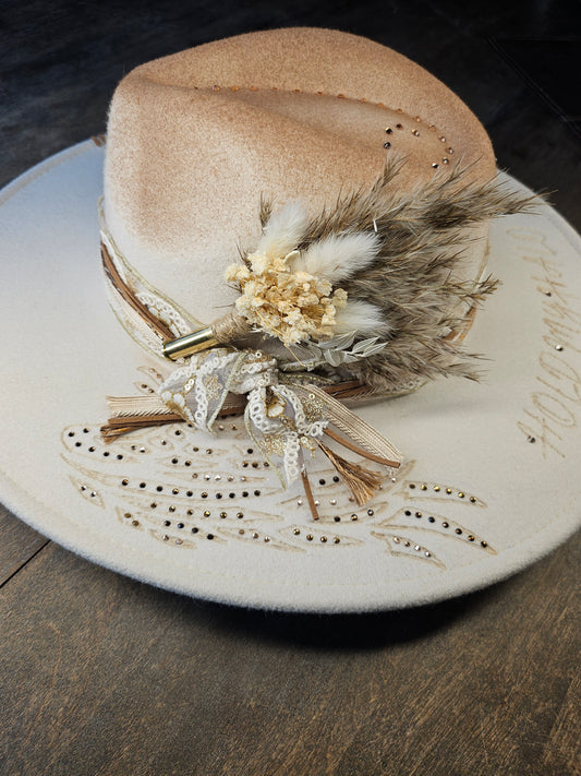 Ivory hand burned fedora cowboy hat with rhinestones
