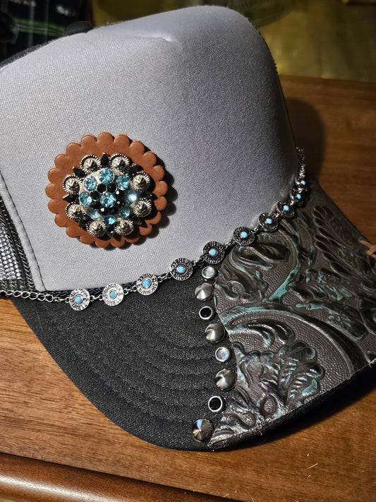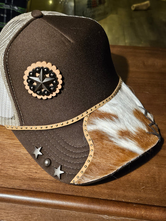 Western trucker hat with cowhide and conchos