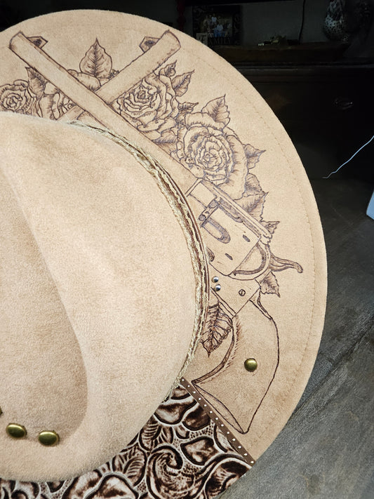 Tan Hand Burned Fedora Cowboy Hat With Guns And Roses
