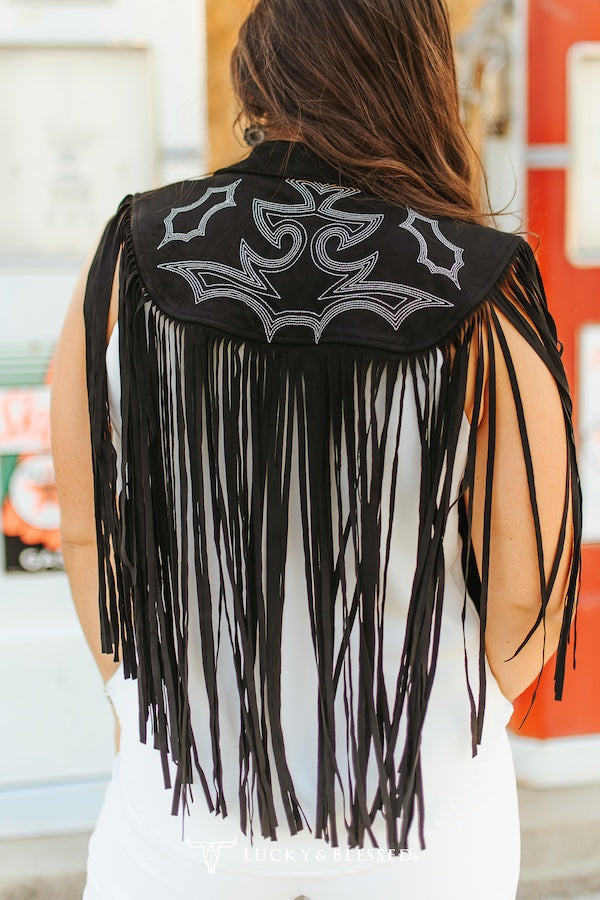 Add drama to any outfit with this stunning black suede-look vest cape featuring extra-long fringe and intricate Western embroidery. The sharp silver thread embroidery dances across the lapel and back yoke, giving this vest a true rodeo-chic vibe. The sleeveless silhouette and lightweight construction make it ideal for layering over bodysuits, dresses, or tanks. Whether styled for a concert, NFR, or boutique photoshoot, this vest is a showstopper.