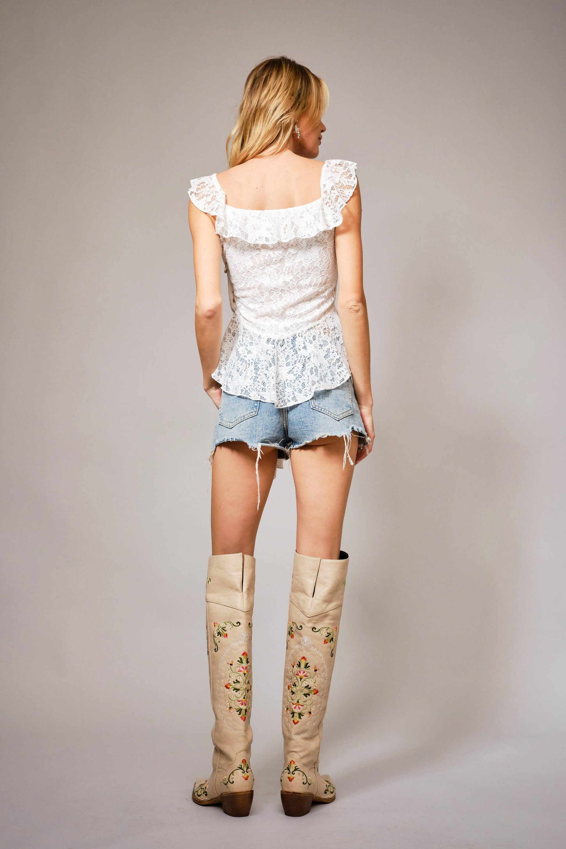 Incredibly soft white Floral lace top featuring a ruffled center, square neckline, and flutter sleeves. Has some stretch with a side zipper. Designed with a curved hemline. 90% Nylon 10% Spandex