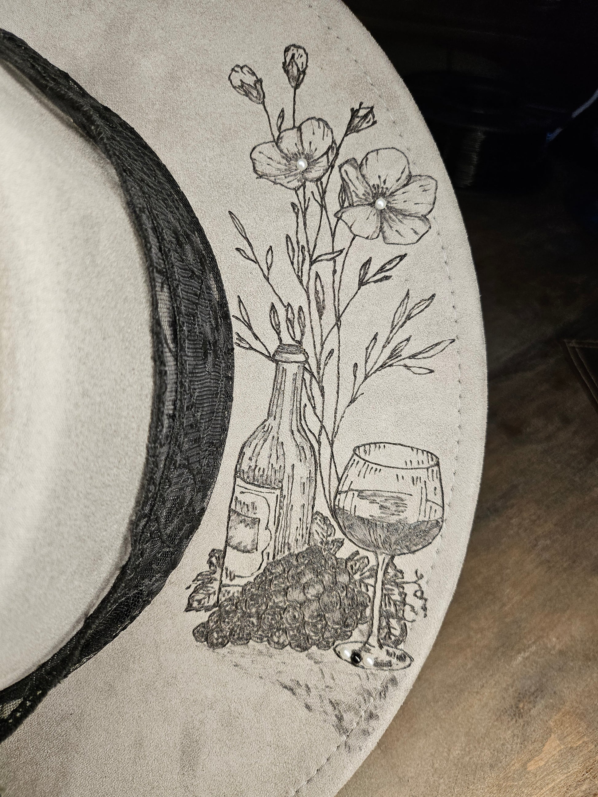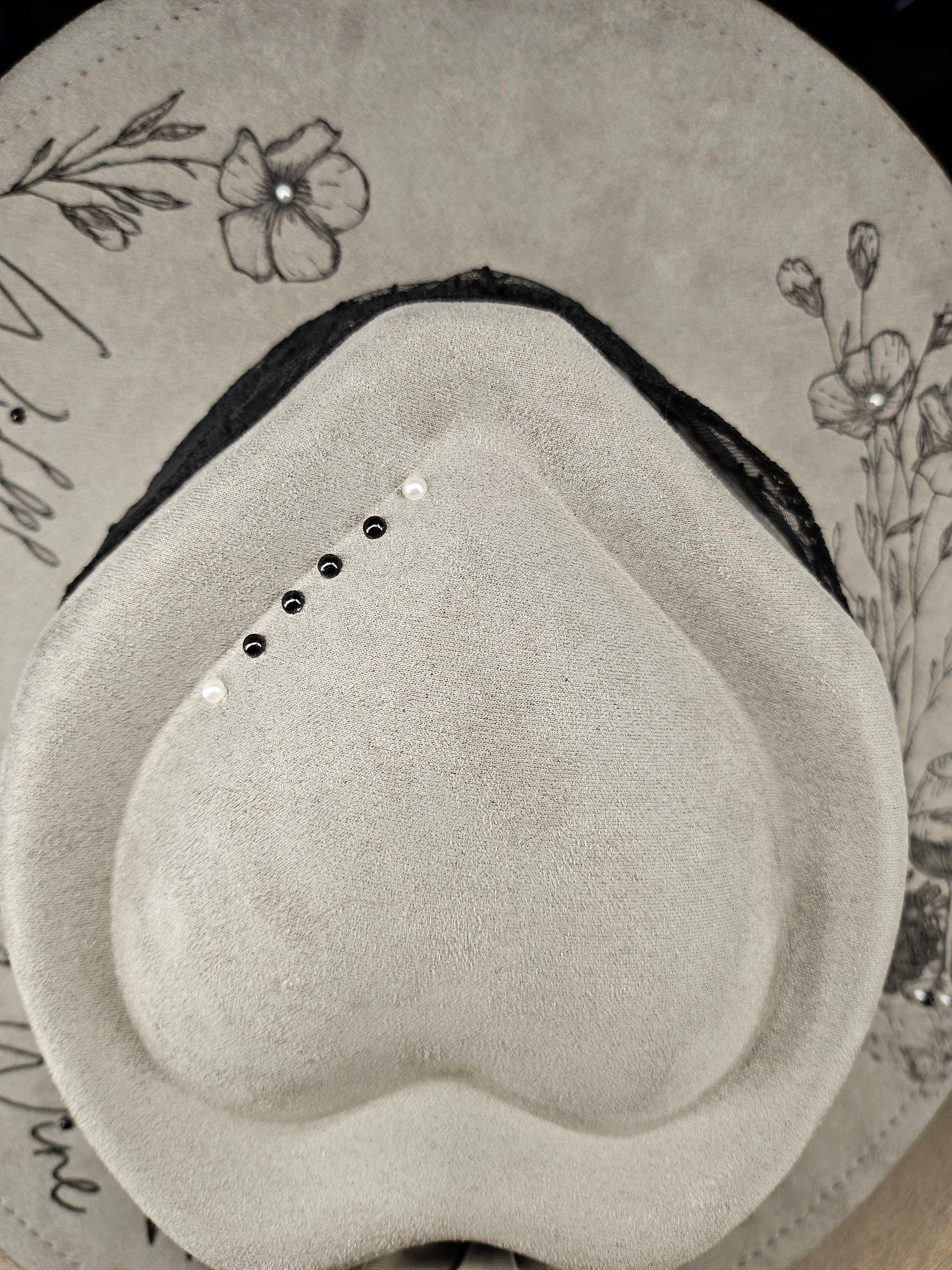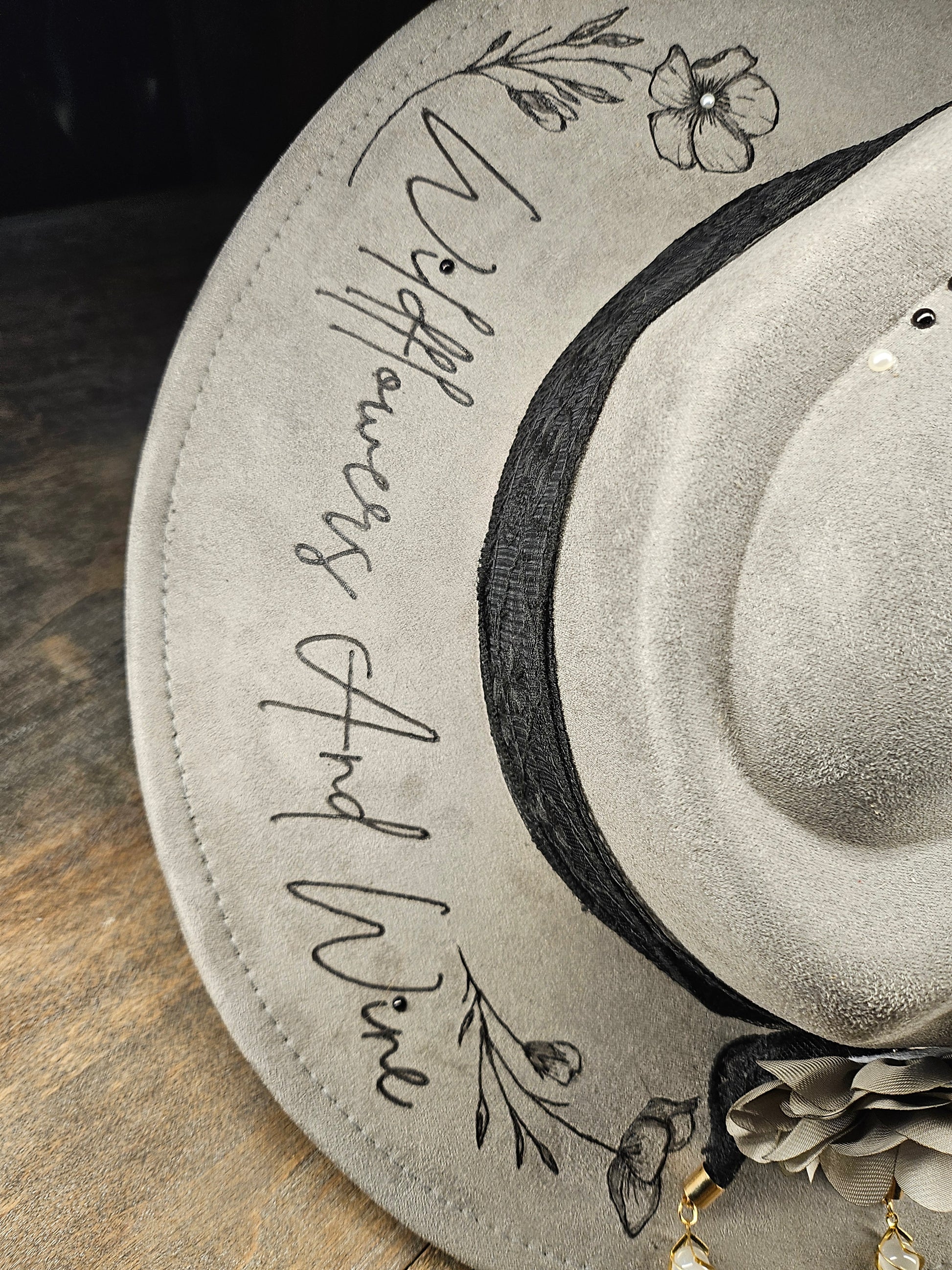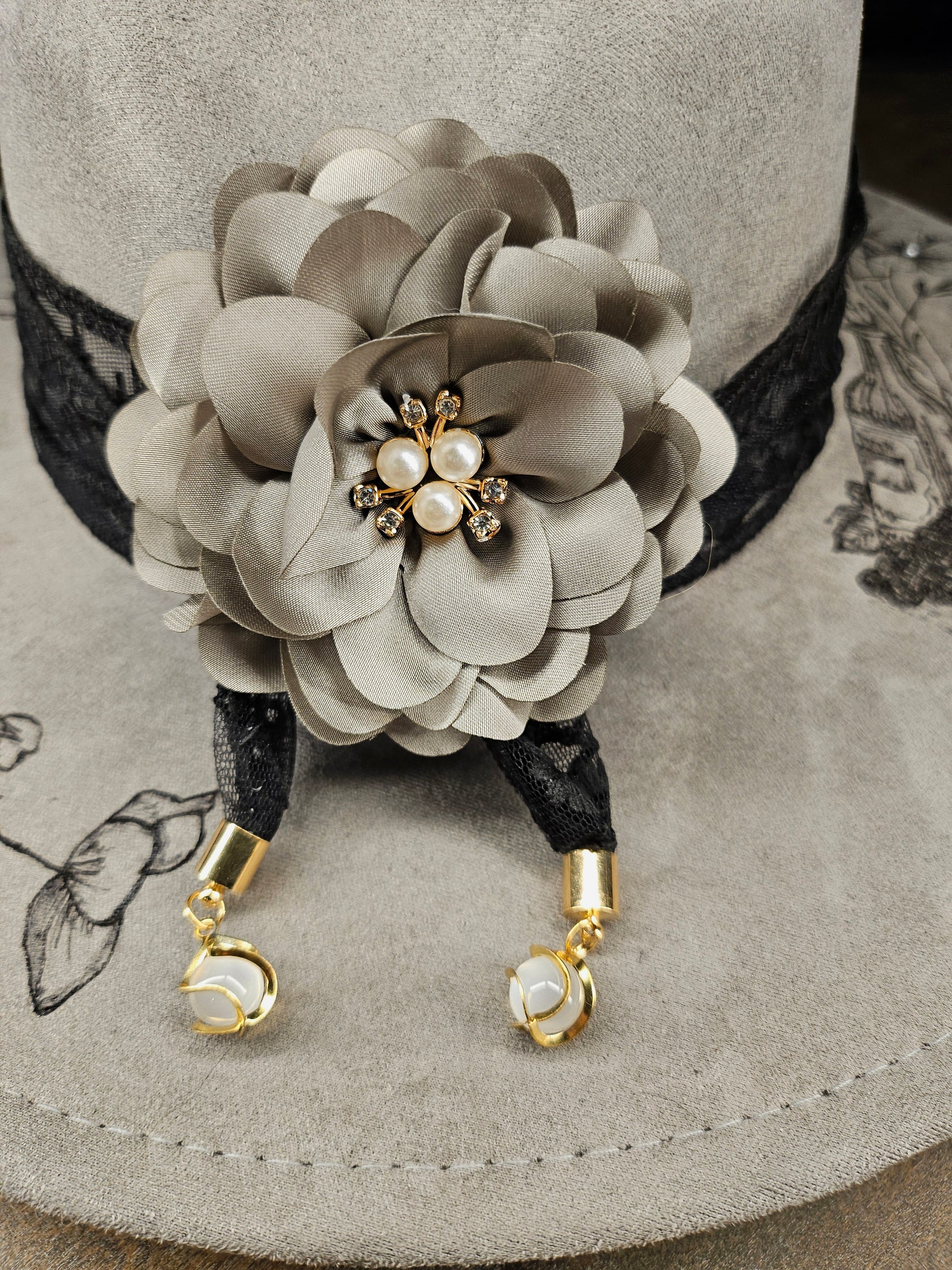 The Grey hand Burned faux suede fedora Cowboy Hat, inspired by Jessie Murph's song Wildflowers and Wine. It features a hand-burned design with a black lace hat band and gold beaded accents. Enhanced with removable silk flower and pearl pin, it includes an adjustable fit with interior ties and a custom satin lining for comfort.