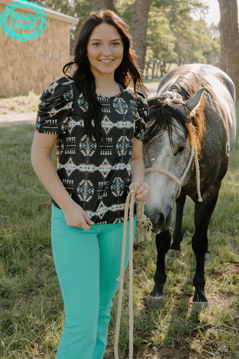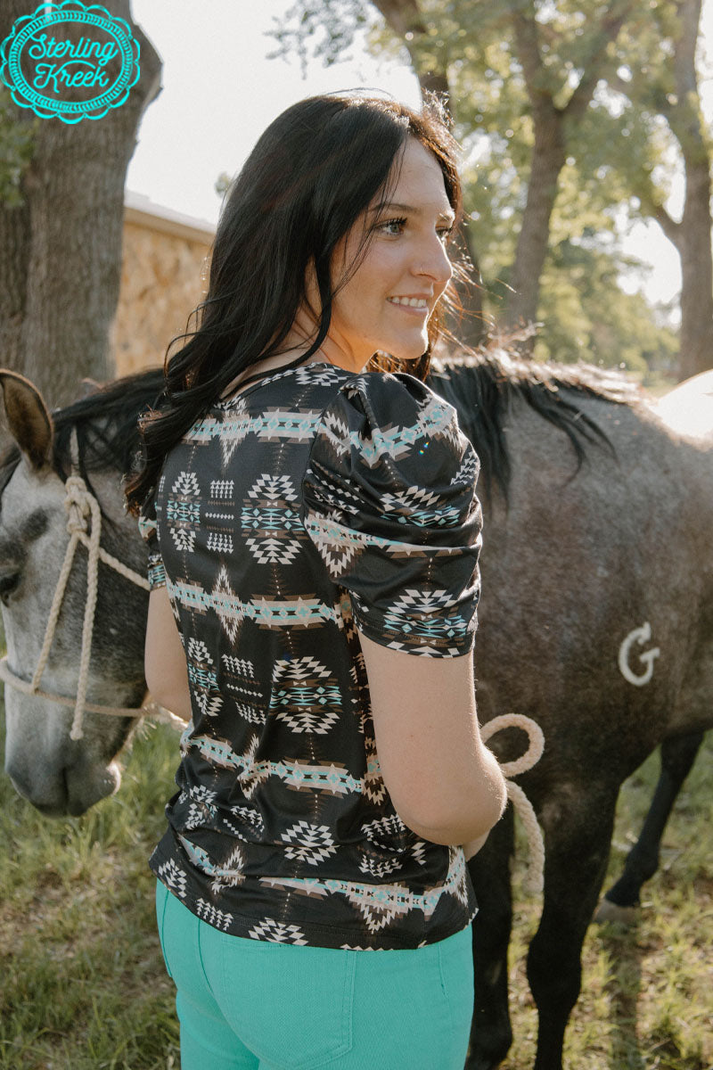 Get ready to turn heads with our Half Grown Top! The black aztec pattern adds a touch of edge, while the bubble sleeve and crew neck provide comfort and style. Perfect for making a statement, this top is guaranteed to elevate your look.
