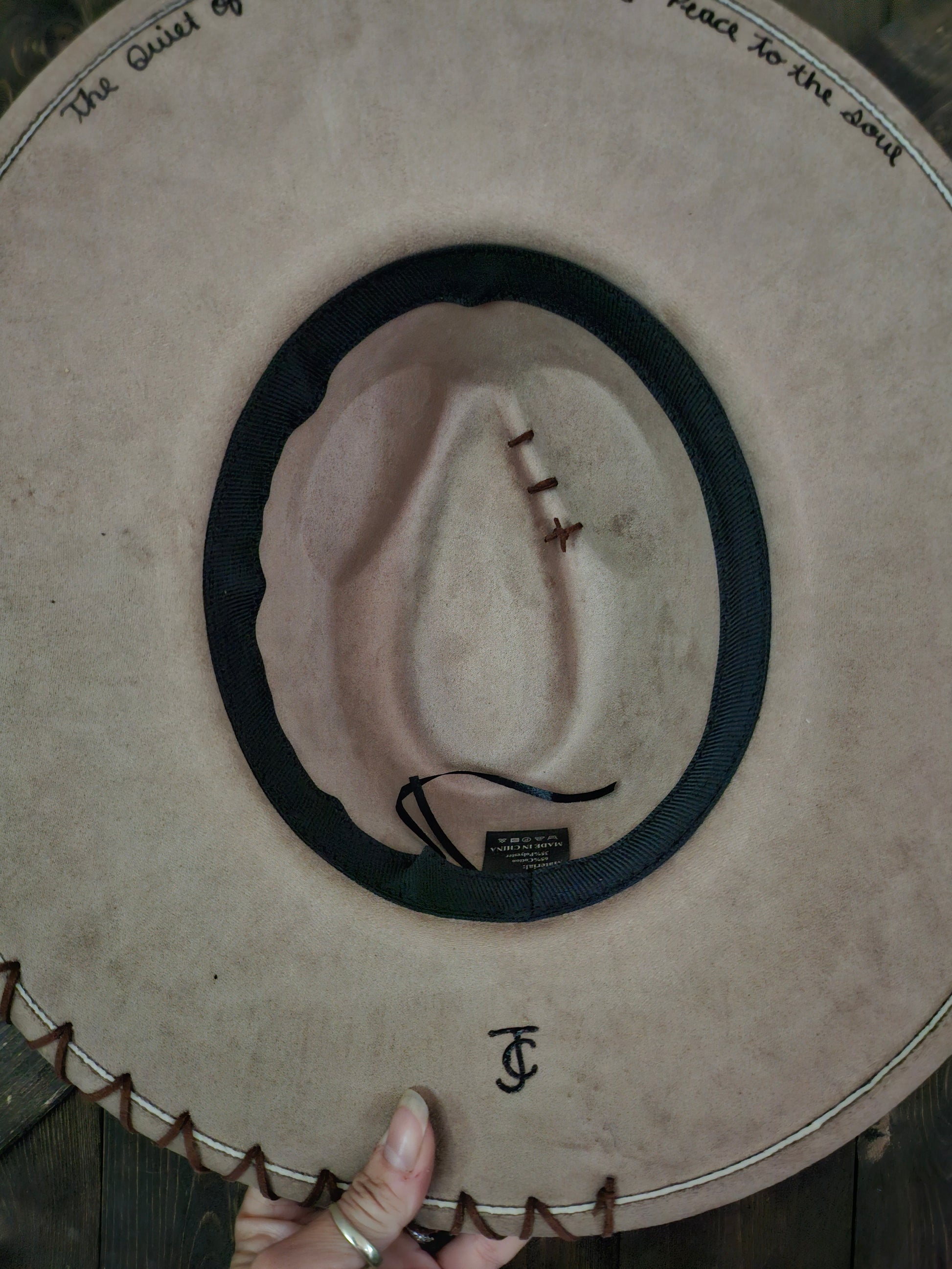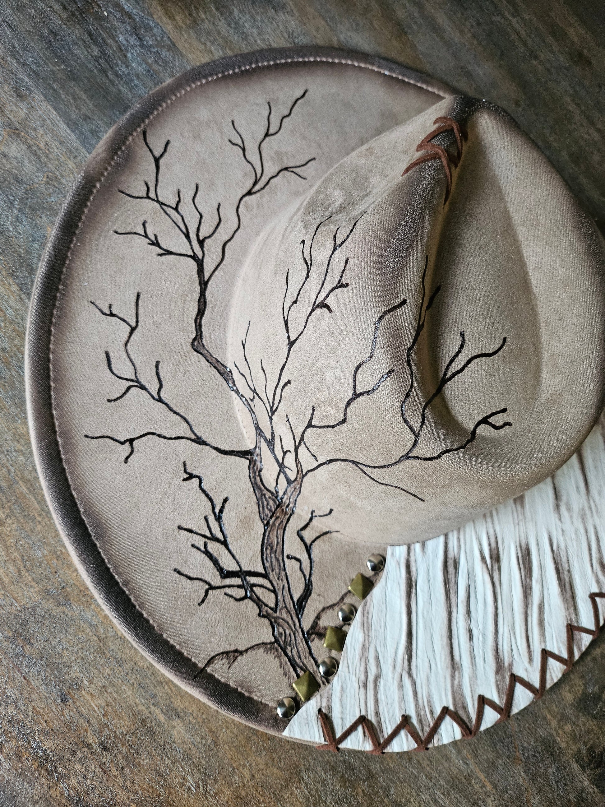 This one of a kind taupe faux suede fedora cowboy hat is fully adjustable with ties inside the sweatband. It has genuine embossed cowhide leather in a birch trre bark pattern. Then hand burned in a winter night Scape with a full moon mountains and a large tree. also is engraved on the underside the saying that says " The quiet of a winter night brings peace to the soul"