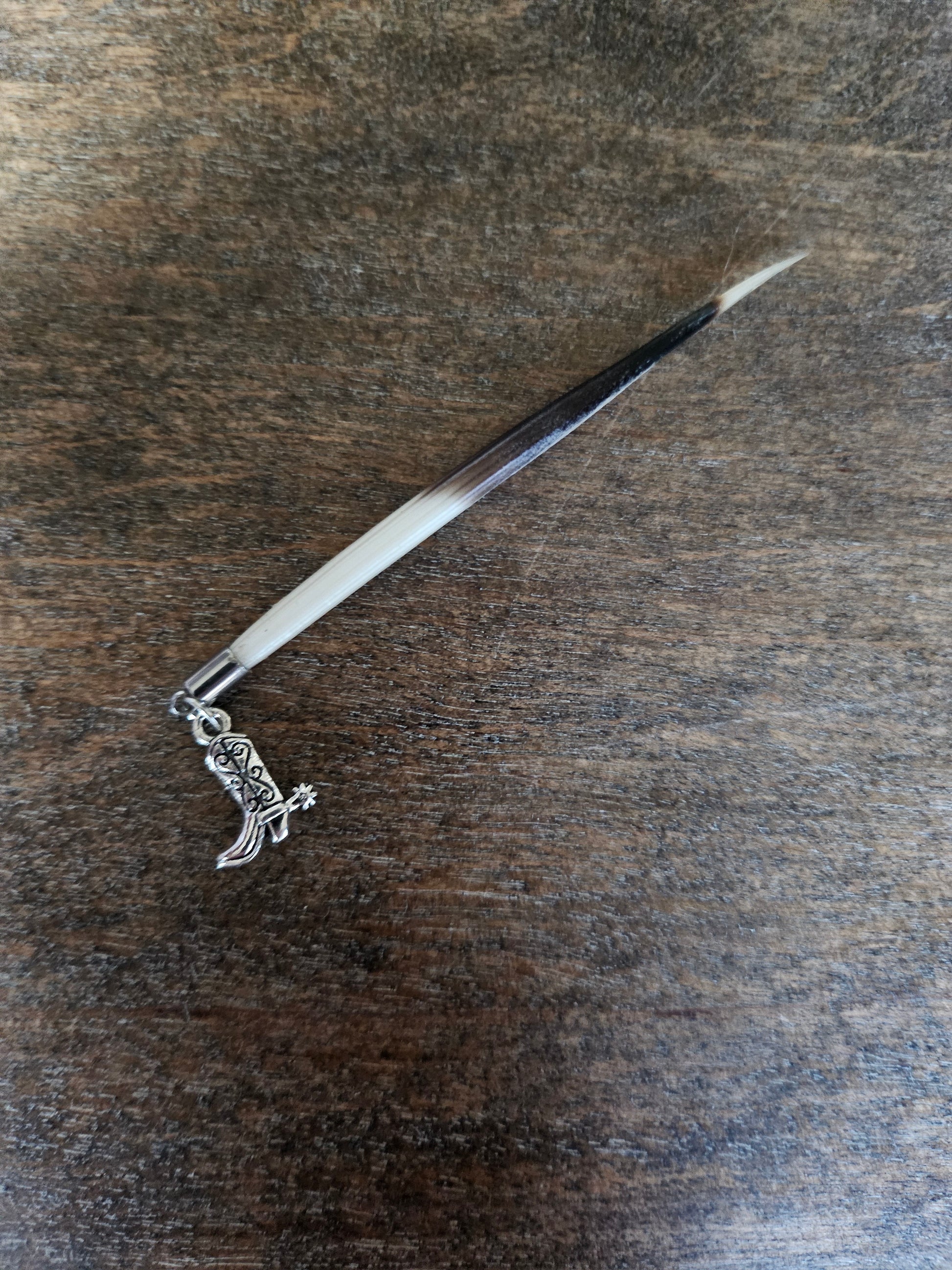 The hatband is genuine white leather with an attached concho. It has a removable feather hat pin and a cowboy toothpick made from a genuine Porcupine quill with cowboy boot charm that comes out of the hatband for use