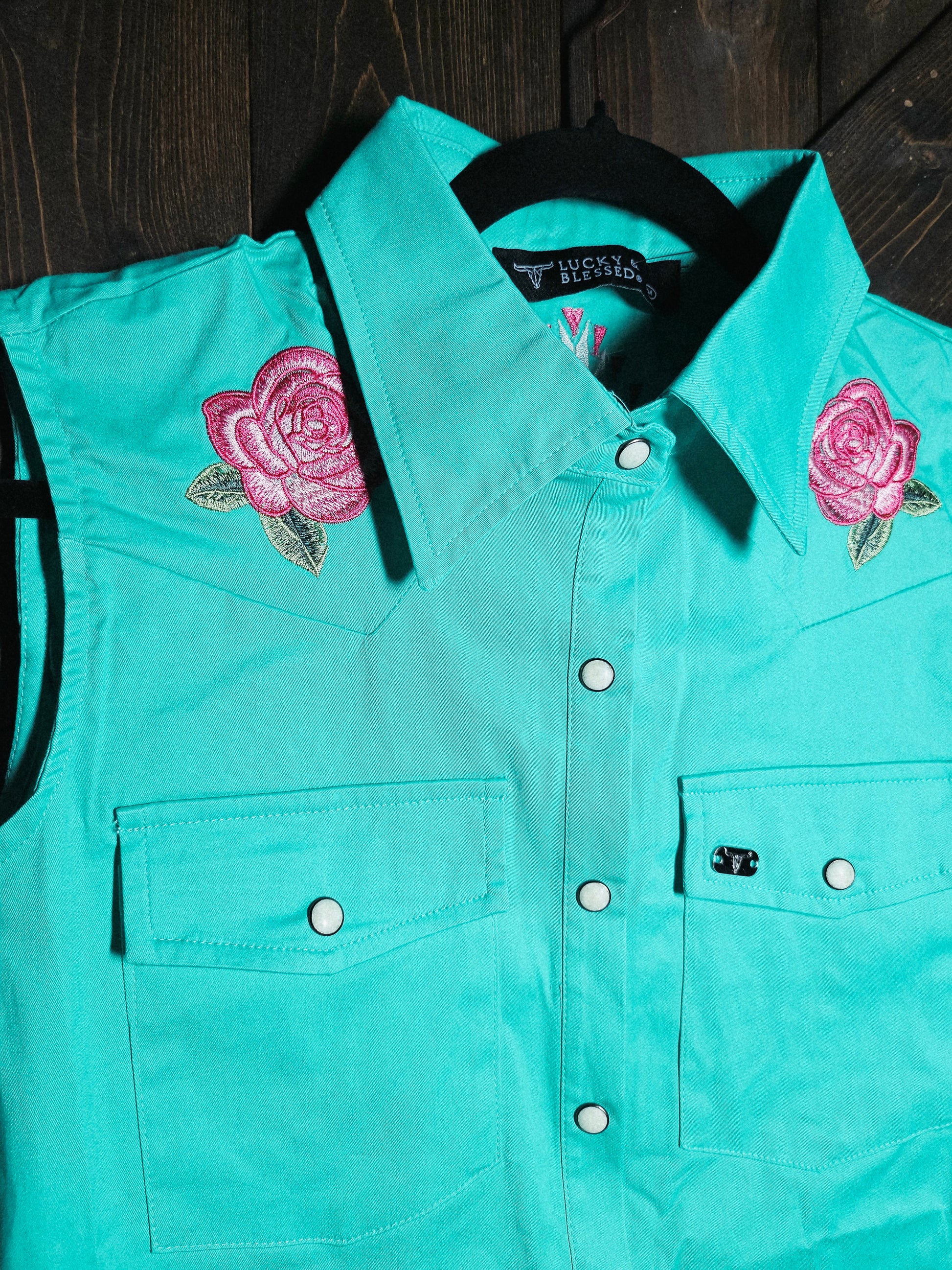 Turquoise Pearl Snap Button Down Floral Embroidered Sleeveless Stretch Tunic Dress