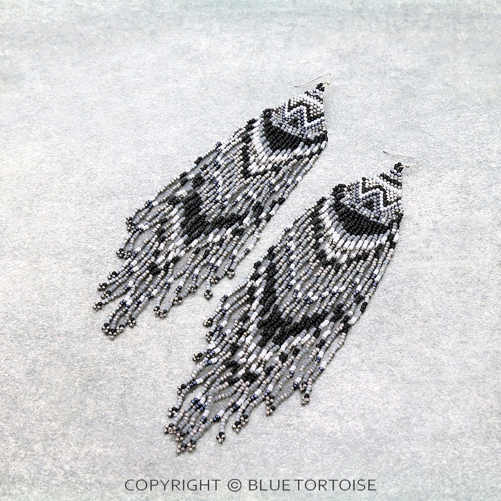Explore your bohemian side with our stunning black and white long beaded boho earrings. Handmade with elegant seed beads, these earrings are perfect for adding a touch of unique style to any outfit. Embrace the beauty of natural materials and elevate your fashion game with these versatile and chic earrings.