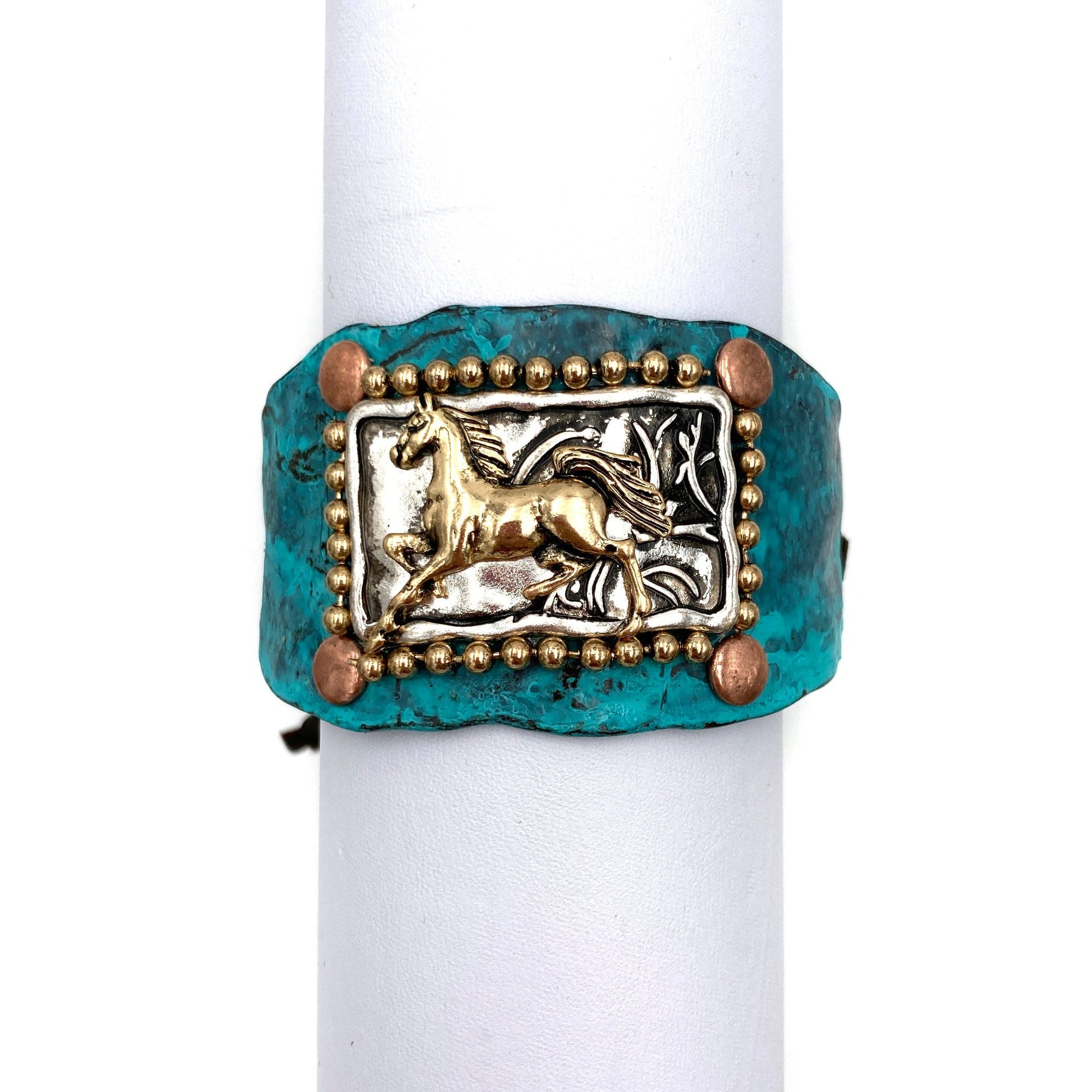 The horse canters and gallops freely in the wild is a sight to behold. Capture this view with our beautiful bracelet. A horse centerpiece bracelet on silver or gold metal plate. Vintage style patina turquoise blue or dark western brown color bracelet cuff. Adjustable black or brown leather straps with beads to fit most wrists. 3 x 2 inches. Approximately 2 ounces. Lead and nickel compliant. Made in US.