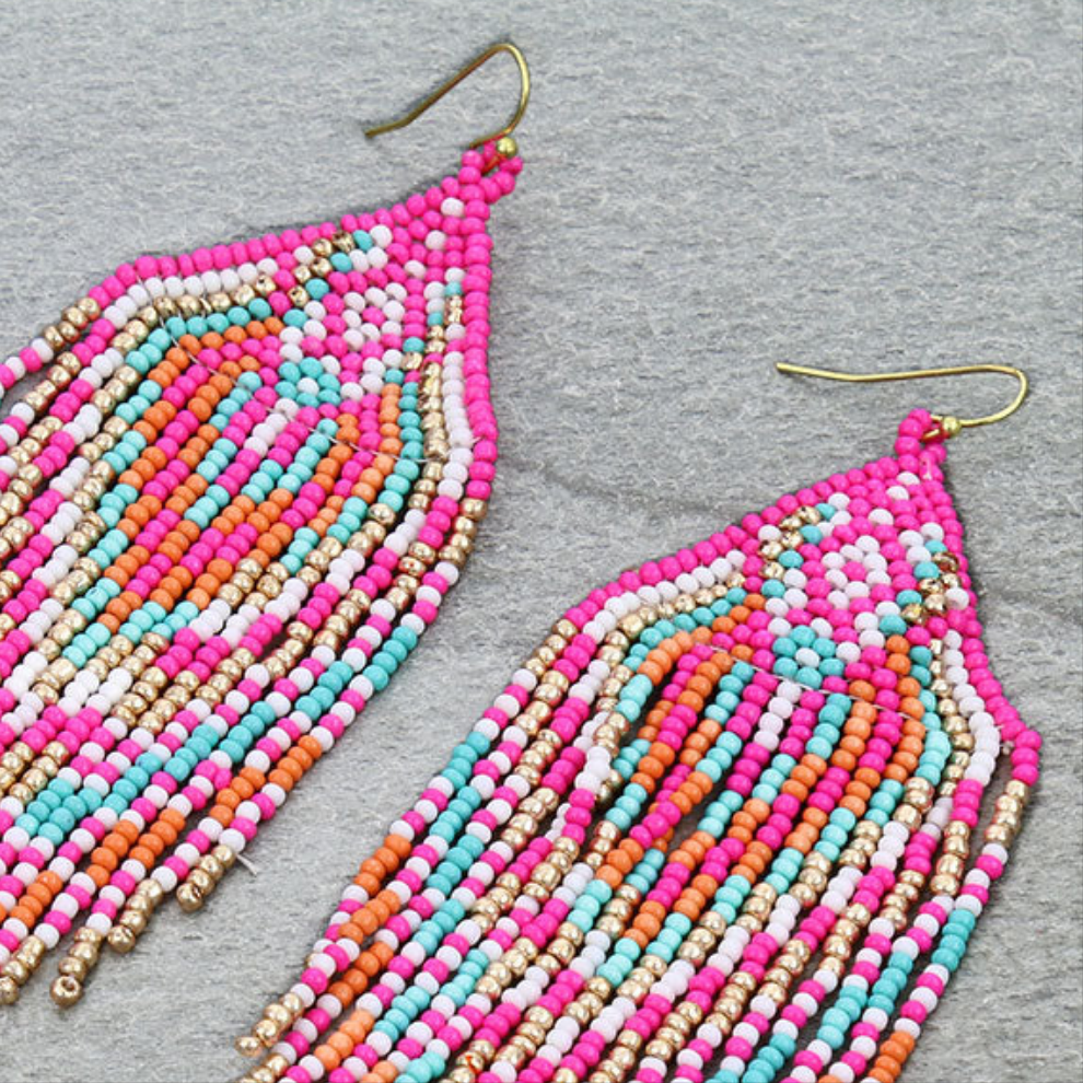 Add a touch of bohemian flair to your wardrobe with these Pink Boho beaded fringe tassel earrings. Made with precision and care, these earrings feature intricately designed beads that will surely elevate any outfit. Get ready to turn heads and make a statement with these trendy and unique earrings.