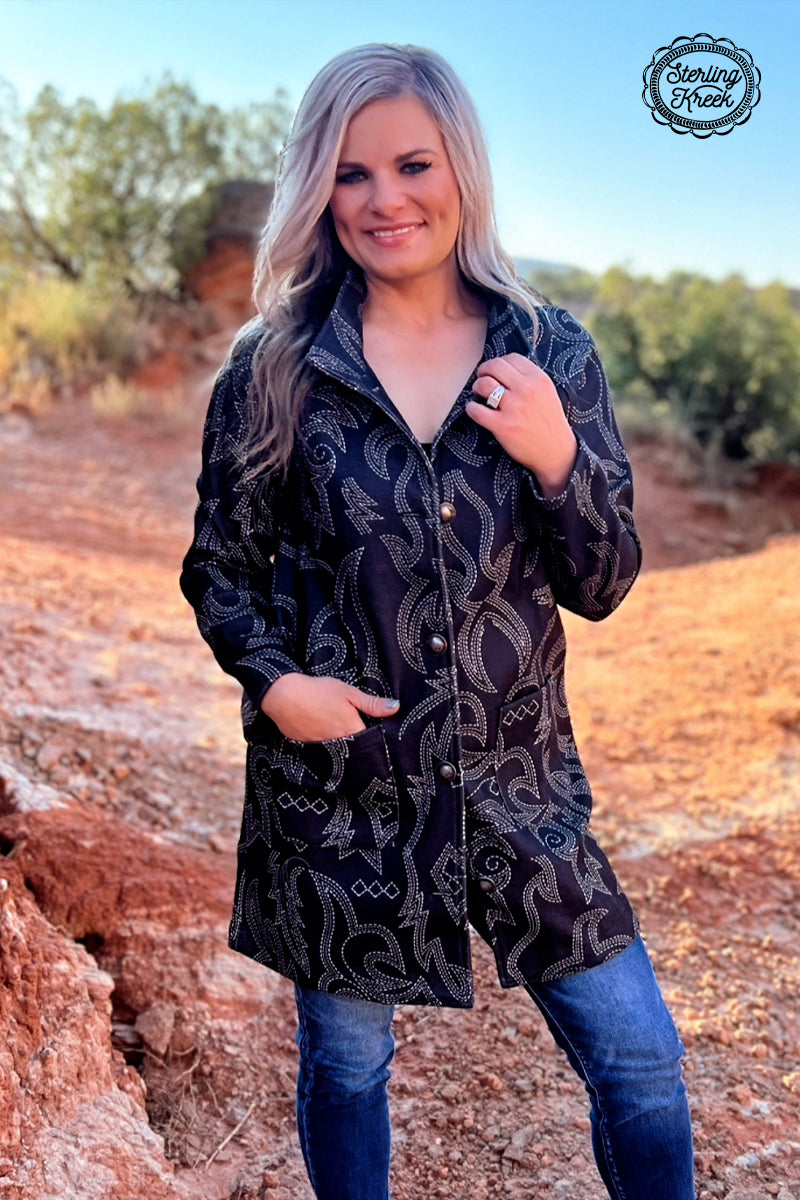 Saddle up and hit the town in style with our Midnight Rider Jacket. This black jacket features a unique cream boot stitch button up design, showcasing your love for Western flair. Get ready to turn some heads (and maybe even lasso a few compliments) in this one-of-a-kind piece.