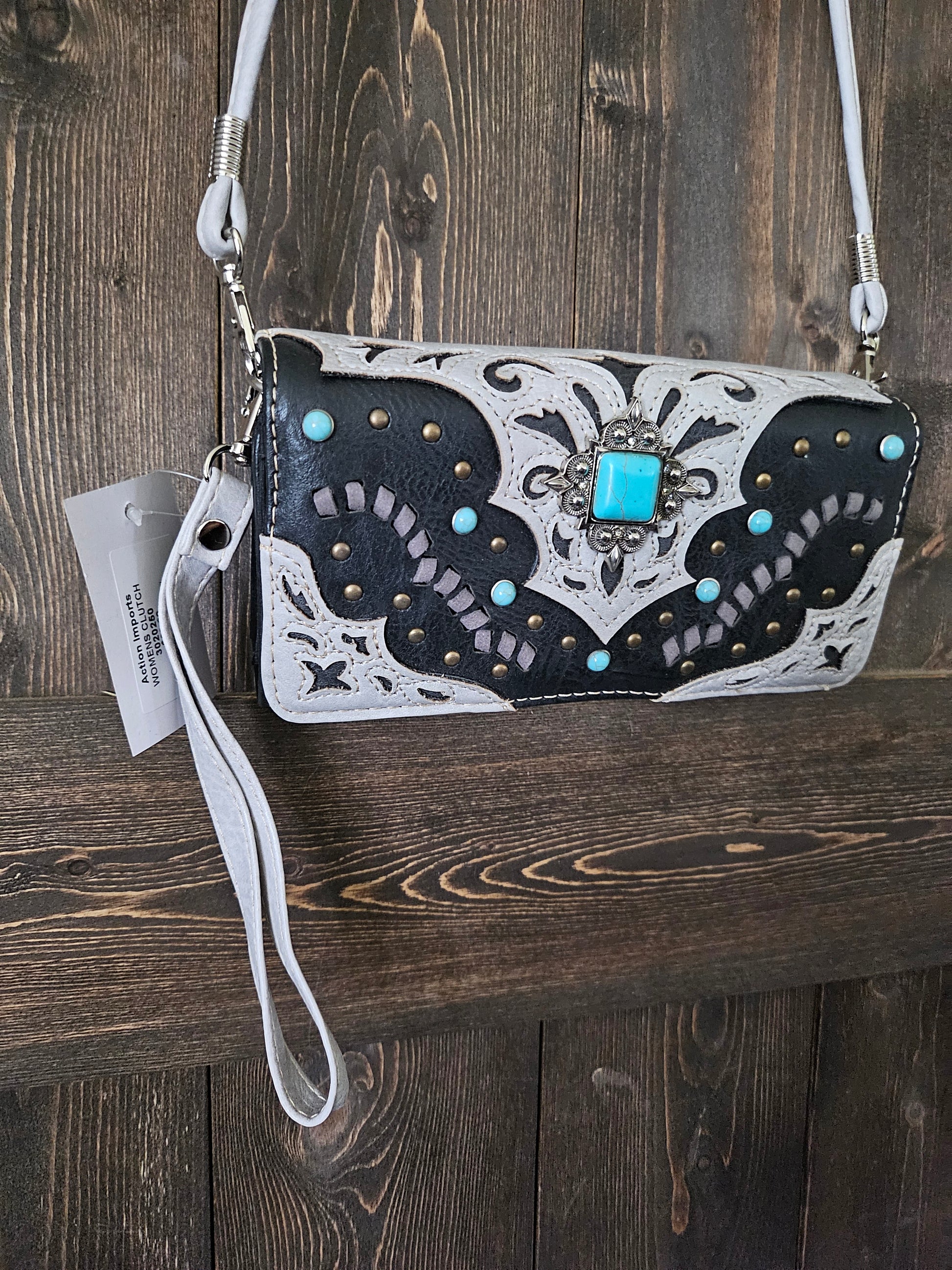 Western Faux Leather Turquoise Accent Wallet with removable crossbody strap and wristlet strap