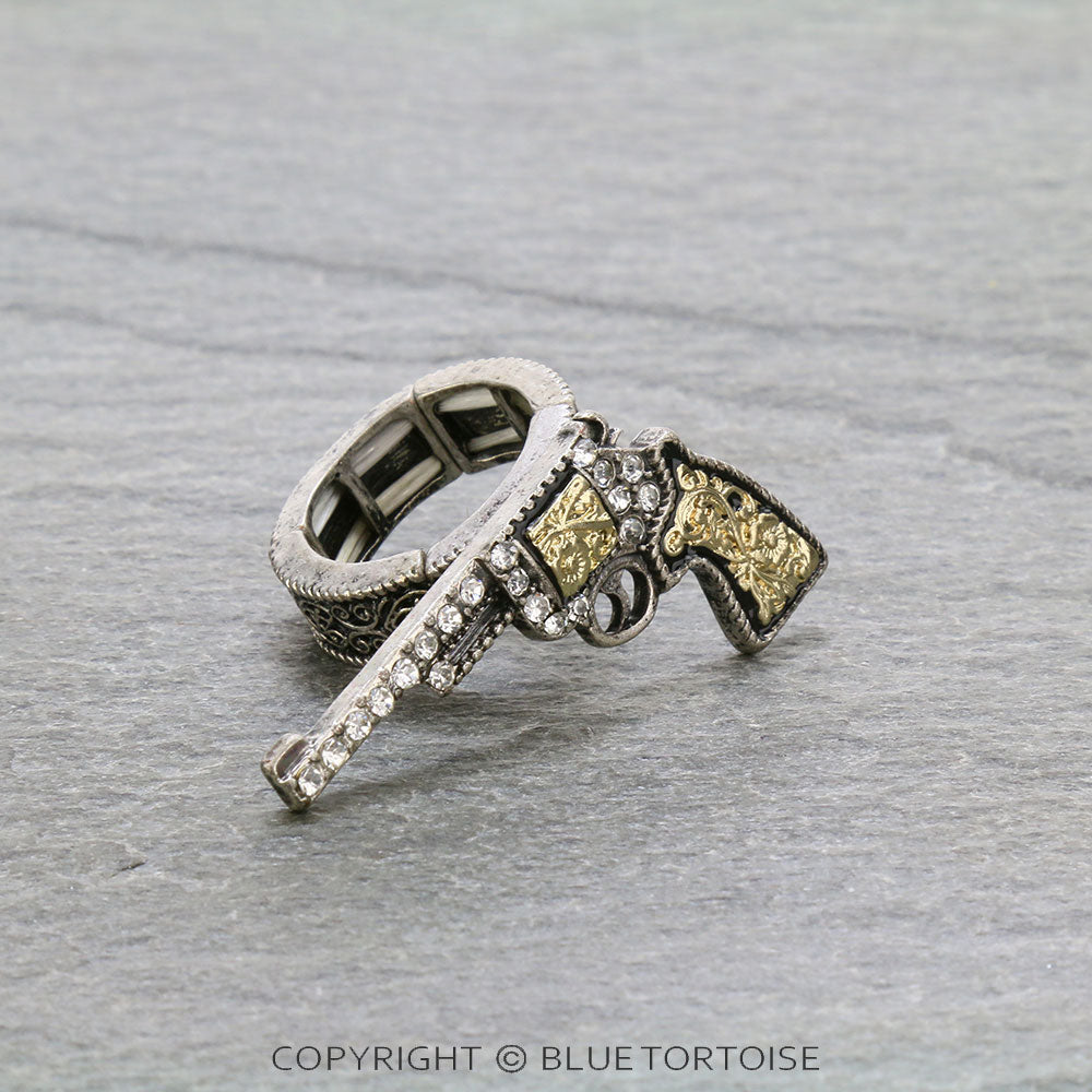 Western Silver and Gold Rhinestone Pistol Stretch Ring